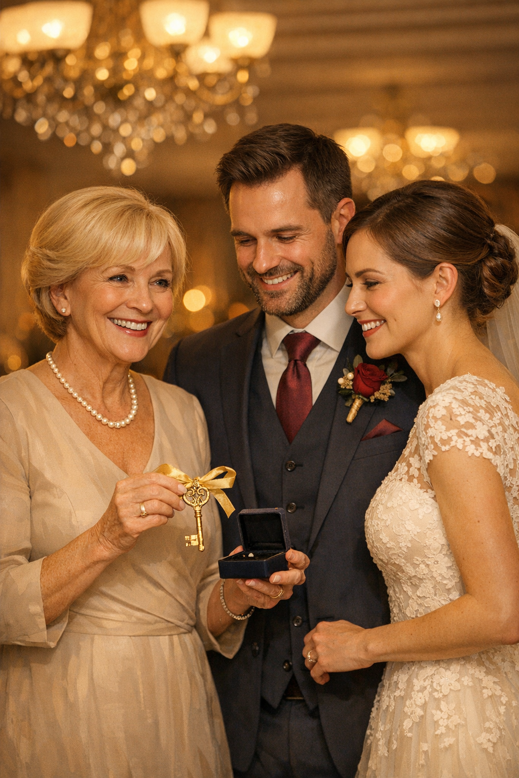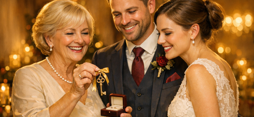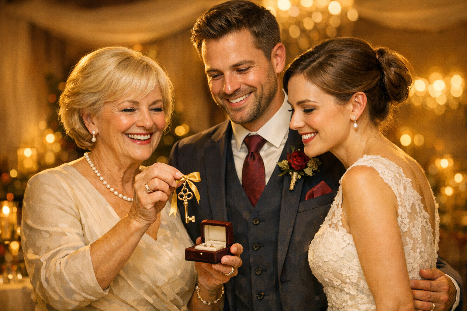 A különös ajándékozás már a lakodalom napján elkezdődött. Amikor a műsorvezető mikrofont nyomott Mária kezébe, az asszony drámai mozdulattal egy bársonnyal bevont párnát húzott elő az asztal alól. A párnán egy kulcscsomó csillogott.