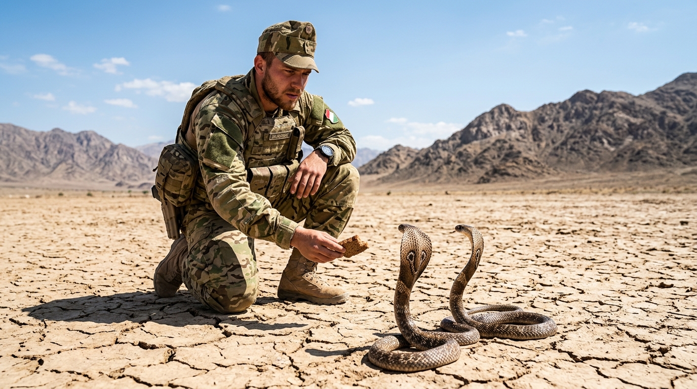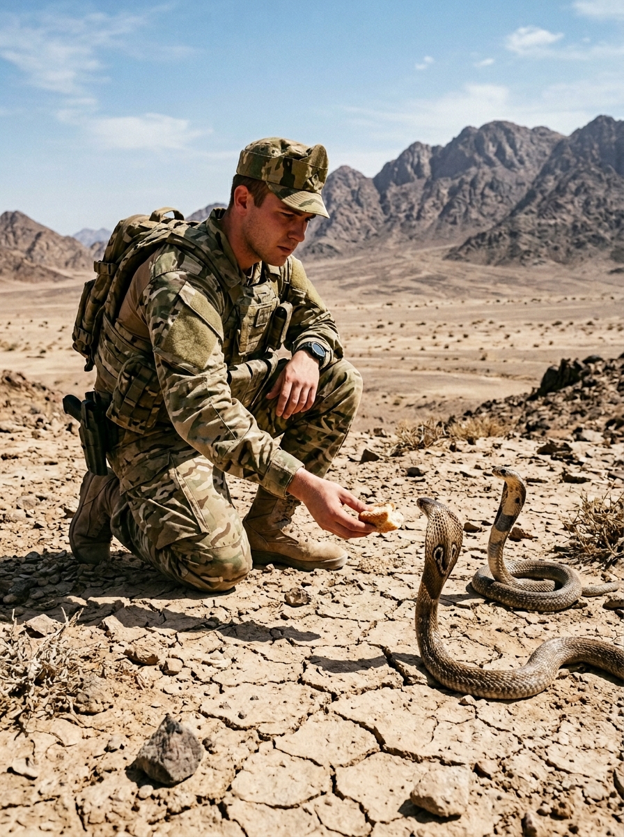 Hogy ne őrüljön bele a feszültségbe, időnként különös, már-már vakmerő elfoglaltságokat keresett magának. Egy alkalommal, amikor a lövészárkok kusza rendszerében kóborolt, furcsa felfedezést tett: egy rejtett fészekre bukkant, benne néhány kobrakölyökkel.