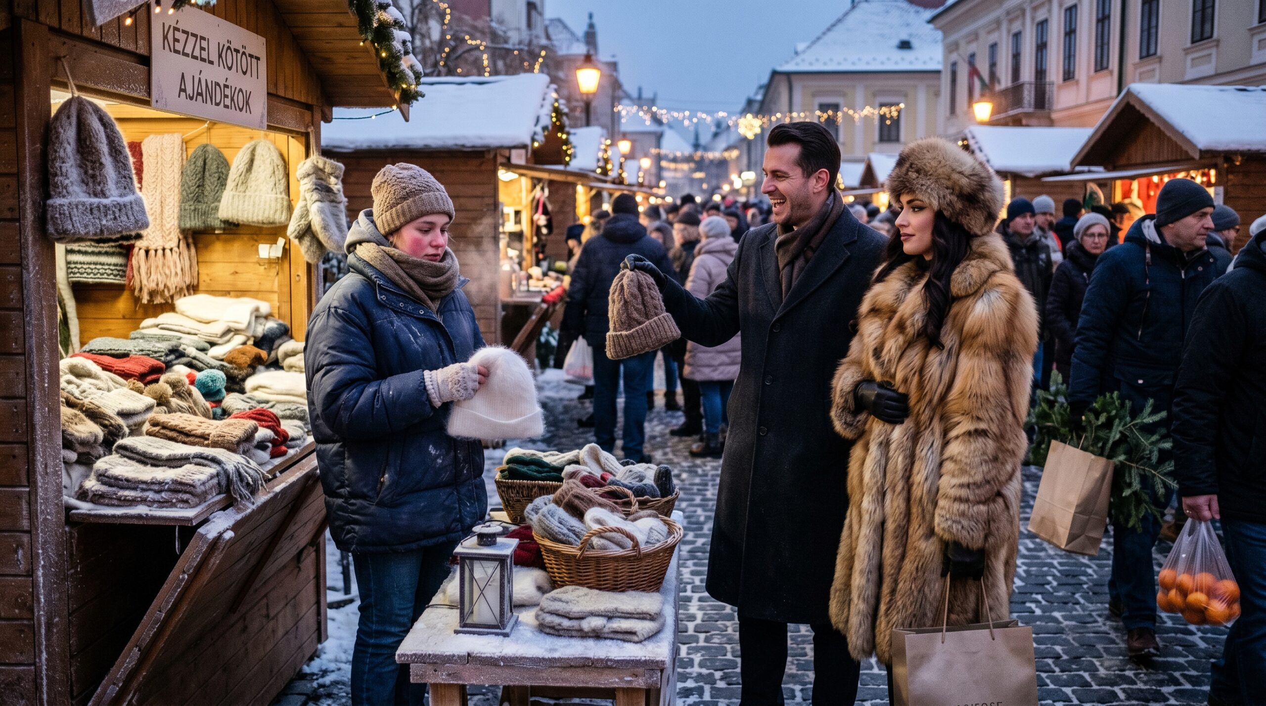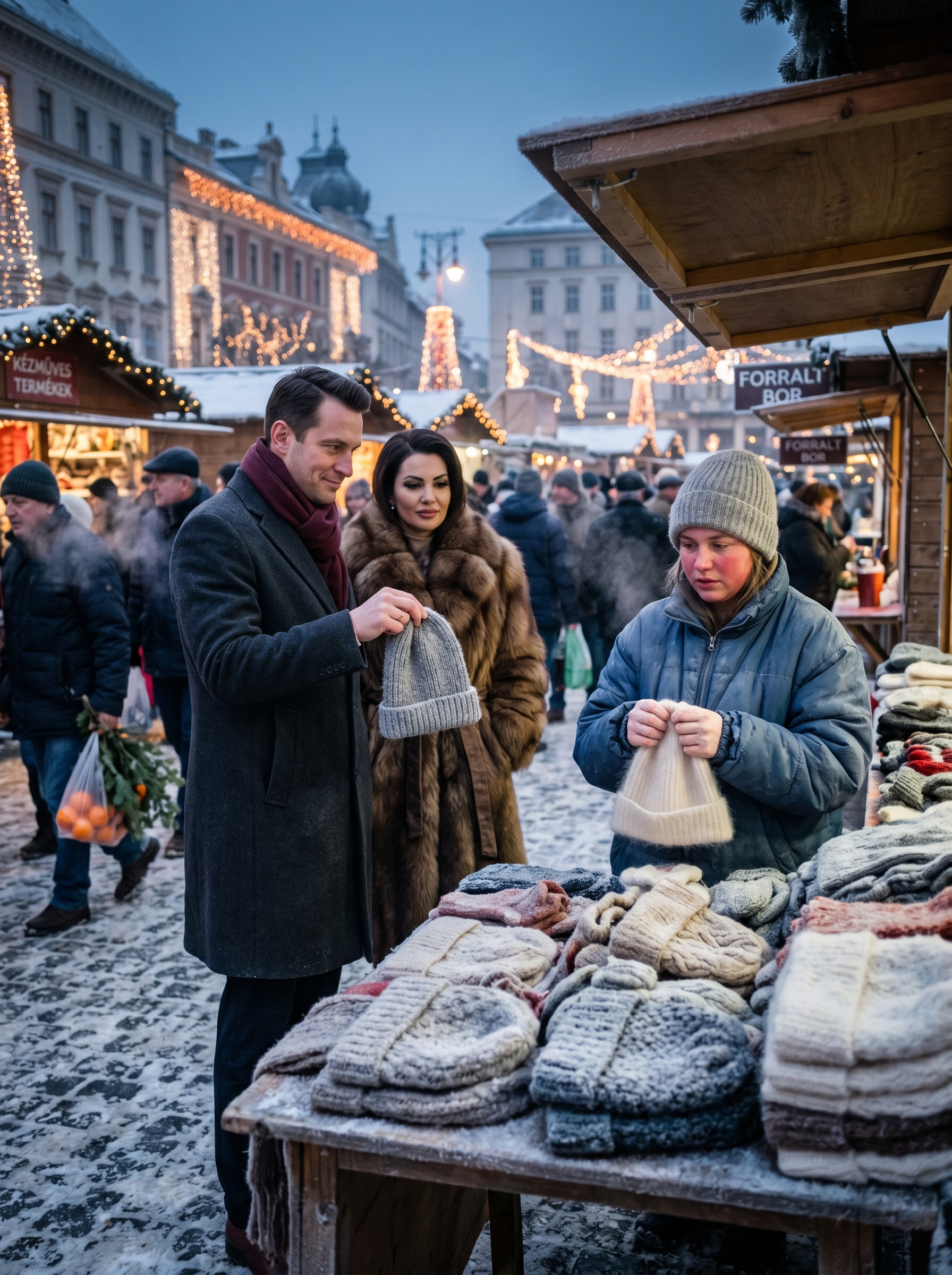 A piac zsibongott az év végi készülődés lázában. Az emberek szatyrokat cipeltek, tele mandarinnal, fenyőágakkal, ajándékcsomagokkal. Lökdösődtek, vitatkoztak, nevettek. Én pedig ott álltam a pult mögött, amelyet kötött holmik borítottak. Sapkák, kesztyűk, sálak – mindaz, amit egy idős kézimunkázóval együtt készítettünk az ősz folyamán. Az ujjaim annyira átfagytak, hogy alig éreztem őket; csak a fonalat morzsolgattam, hátha ettől újra élet költözik beléjük.