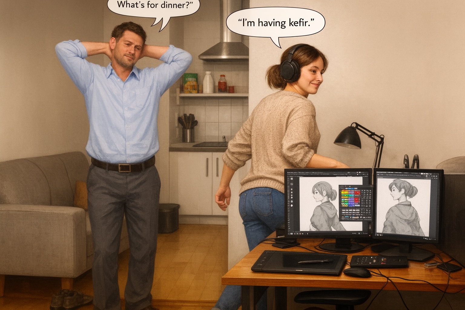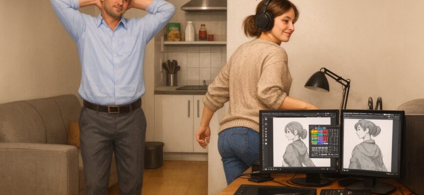 A dolgozósarokban ült, teljesen belefeledkezve a monitorba. Fején nagy, zárt fejhallgató volt, az asztalon digitális rajzprogram futott, a keze gyors, pontos mozdulatokkal dolgozott.