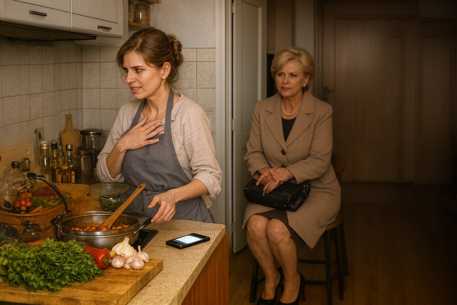 A mondat a levegőben maradt, a feszültség pedig sűrűn nehezedett a konyhára, előkészítve azt a pillanatot, amikor valaki belép az ajtón, és minden tovább bonyolódik.