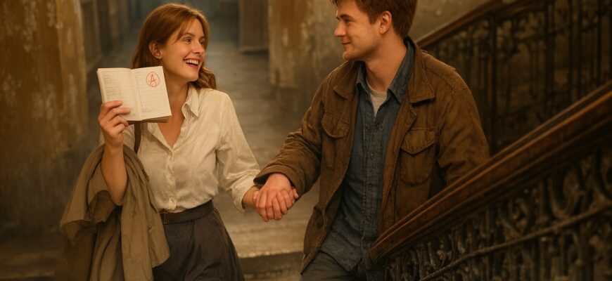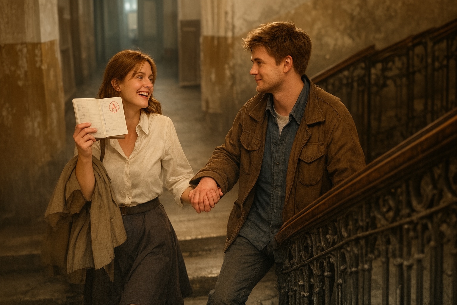 Márton kitárta a nehéz ajtót, és kiléptek az utcára. A kapunál Lilla azonnal meglátta András magas alakját egy csokor virággal, és elpirult.