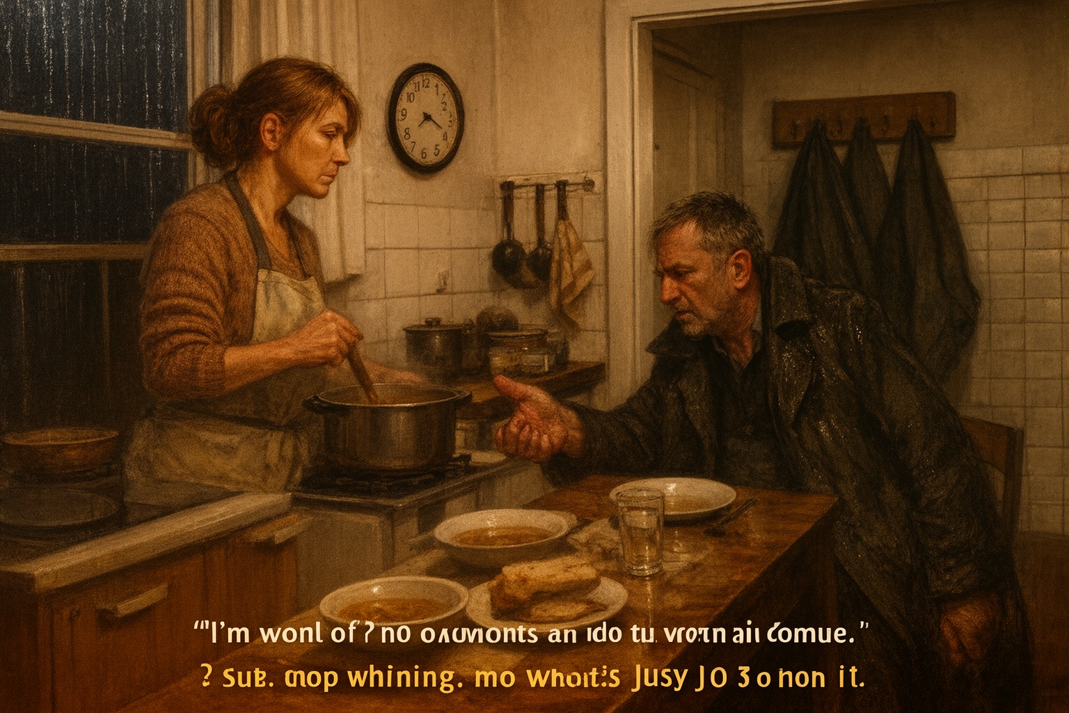 Anna Csernáti lassú mozdulatokkal kavargatta a levest, közben újra meg újra az órára pillantott. Negyed hét híján volt, vagyis Gábor Várnai perceken belül hazaér. Odakint finom, őszi permet esett; az esőcseppek lustán csorogtak végig az ablakon, szabálytalan csíkokat hagyva maguk után. Huszonhárom éve várta így a férjét vacsorával – ez a megszokott esti rend annyira belé ivódott, hogy már a létezése részévé vált.