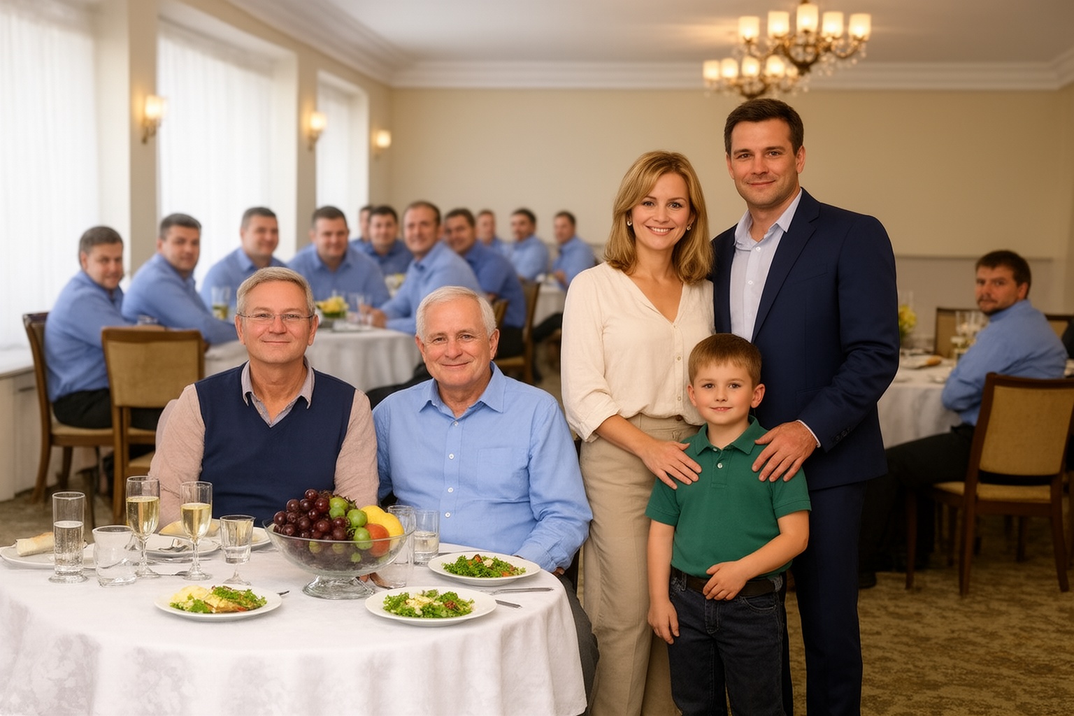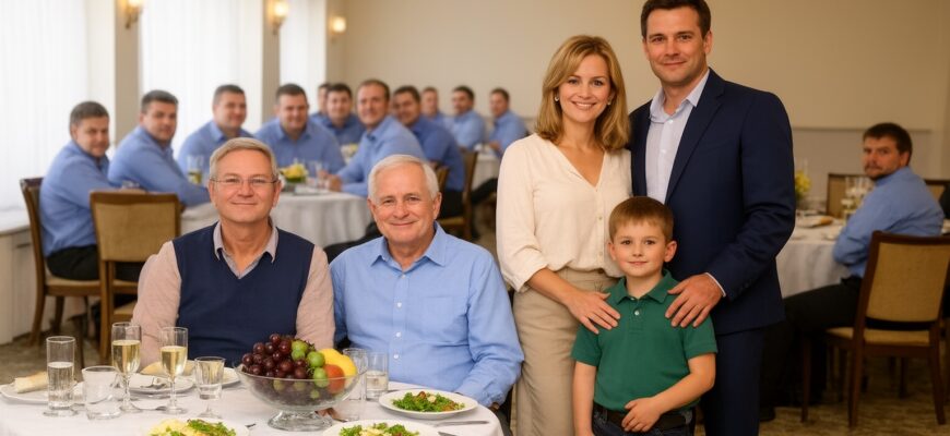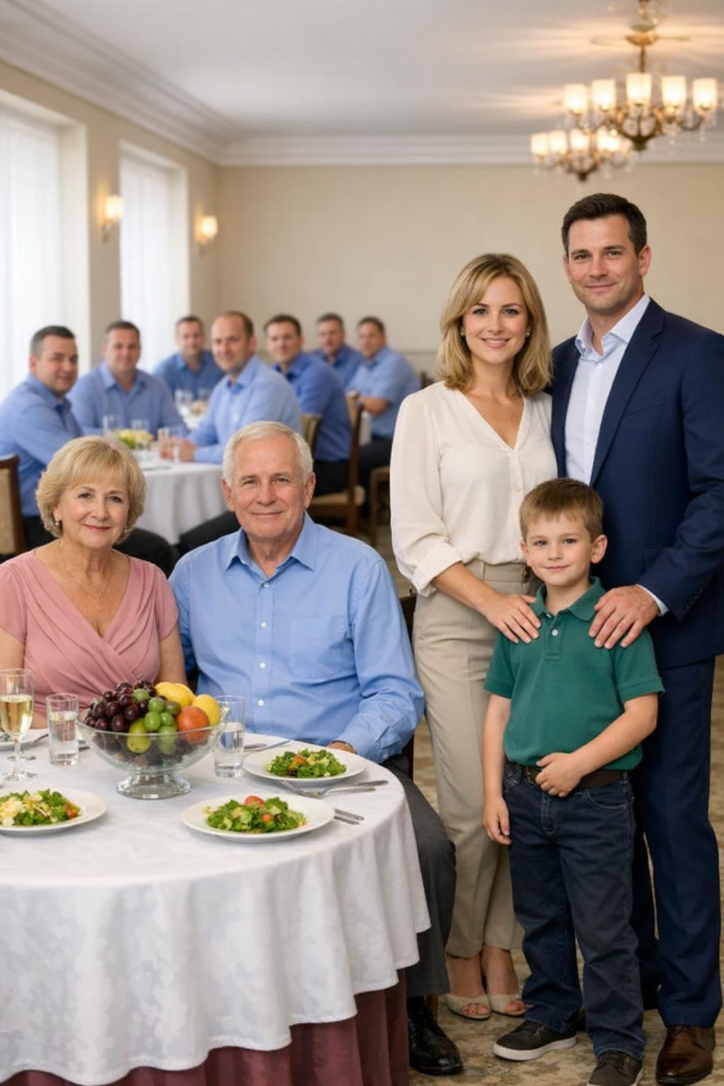 A beszélgetések elhaltak, minden fej odafordult. Egy férfi lépett be, akiről lehetetlen volt levenni a szemet — nem hivalkodóan, hanem a kifogástalan szabás, a drága anyag és a magabiztos tartás miatt. Mellette egy nő haladt, krémszínű ruhában, magazinba illő frizurával. A kezét egy körülbelül nyolcéves fiú fogta, akit úgy öltöztettek fel, mintha diplomáciai fogadásra érkezne.