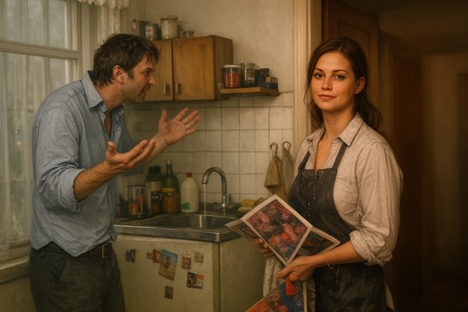 Renáta Kozma a mosogatónál állt, megdermedve, mintha egy film képkockája fagyott volna meg körülötte. A víz még csöpögött az ujjairól, végigfolyt a kötényén, le a csuklóján, mint egy melodrámában túlzott könnyekkel küzdő olasz úriember bánata, akit igazságtalanul vádolnak meg tiltott érzelmekkel.