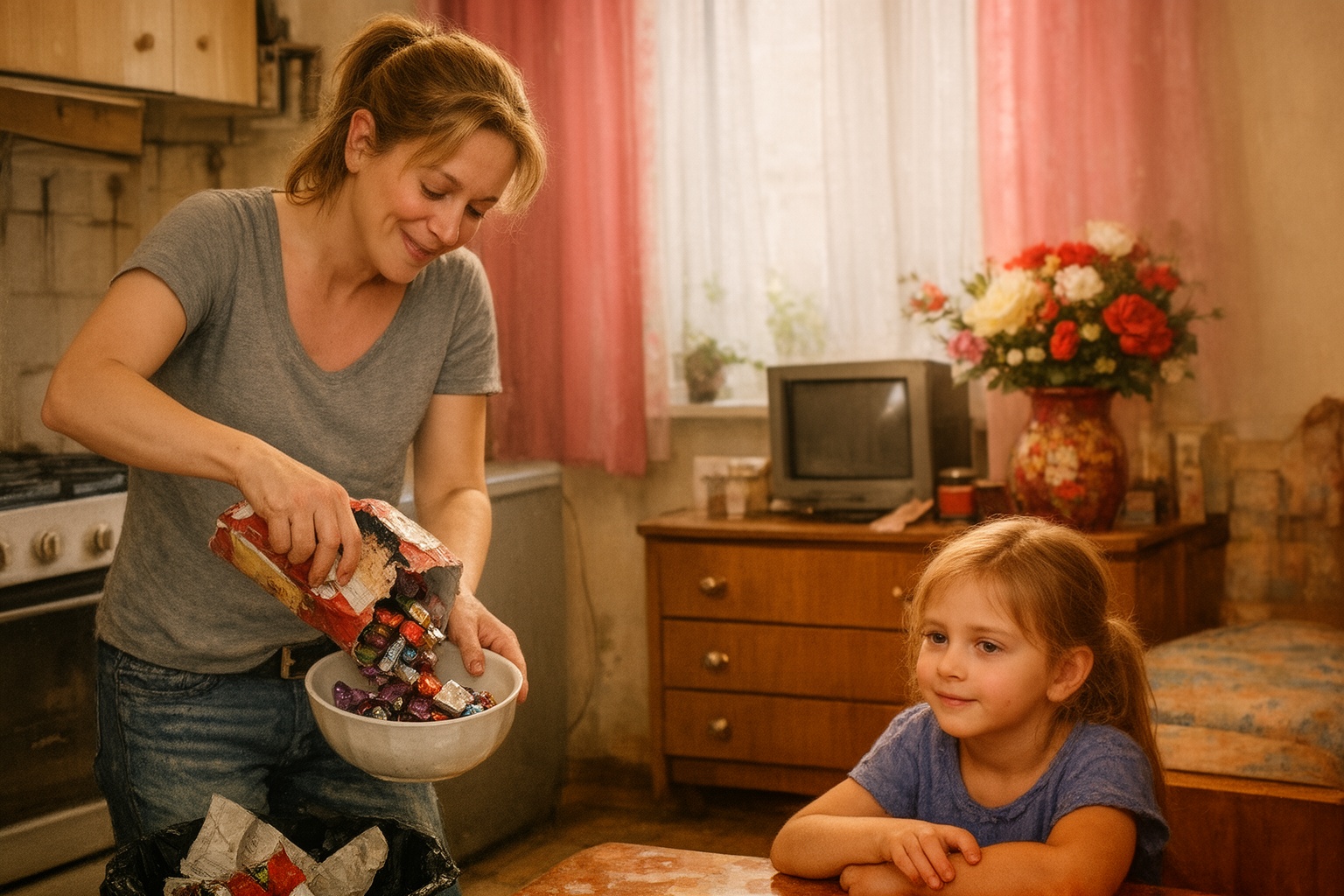 — Ugyan már, mit számít, hogy gyűrött — legyintett ilyenkor. — Szinte ingyen volt, belül minden rendben van. Egyél nyugodtan! — mondta, miközben a cukorkákat egy tálba öntötte, a sérült dobozt pedig gondolkodás nélkül a szemetesbe dobta.