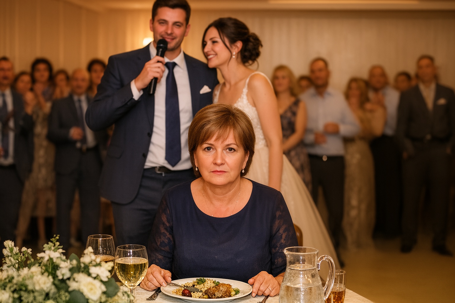 Bent a terem hatalmas volt: csillárerdő, élő orchideák, zenekar. Elvezettek a központi asztalok mellett, ahol Viktória szülei és a fontos vendégek ültek. A nyolcas számú asztal a terem szélén várt rám, és már az első pillanatban éreztem, hogy egészen más világ kezdődik ott.