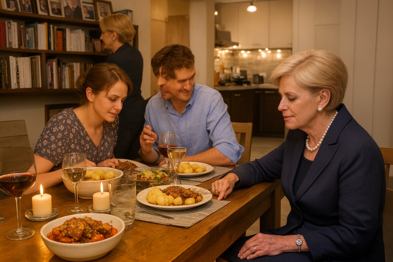 A telefonja finoman megrezzent: Balázs üzent, hogy már úton vannak az édesanyjával, perceken belül megérkeznek. Nóra gyors léptekkel ment a konyhába, ellenőrizte a sütőben sülő csirkét, majd feltette főni a krumplit. Mindennek készen kellett lennie, mire csengetnek.