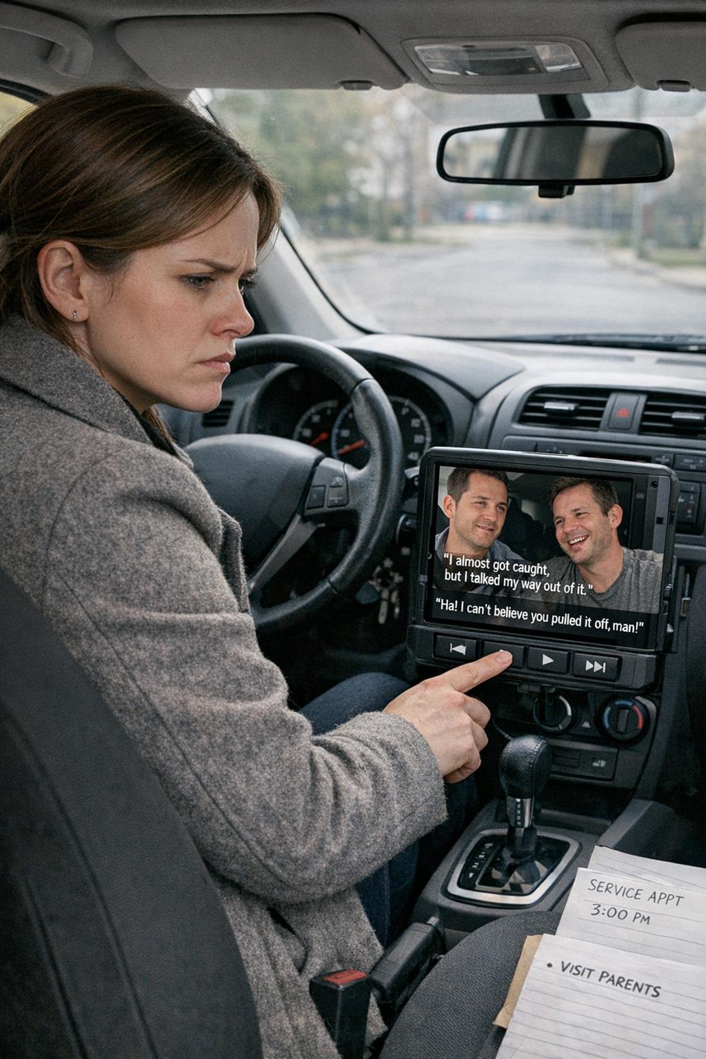 Nóra a férje autójával indult útnak, mert a saját kocsiját szervizbe vitte, a szüleihez pedig mindenképpen ki kellett mennie a külvárosba. Már megszokásból indította el a fedélzeti kamera felvételeit – nem azért, mert gyanakodott volna, egyszerűen rituálévá vált nála, hogy meggyőződjön róla: minden rendben van.