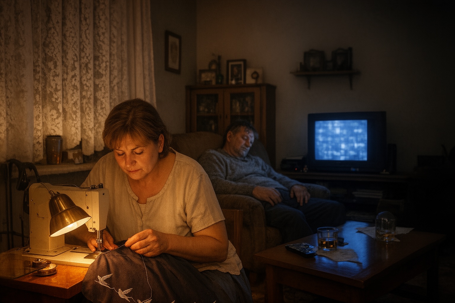 Nóra éjszakánként ült a varrógép mellé, amikor Gergő már félálomban bámulta a televízió villódzó képernyőjét. Leoltotta a mennyezeti lámpát, csak az asztali fény maradt, és csendben nekilátott az alkotásnak.