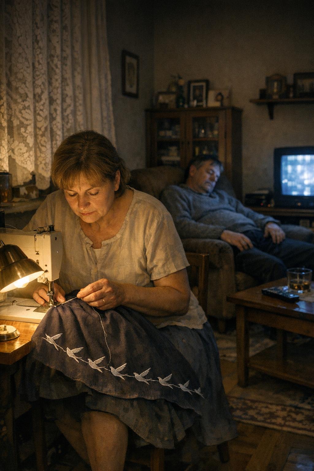 Három teljes hónapon át, kilencven ellopott éjszakán keresztül dolgozott, miközben más pihent volna. A ruha alján ezüstös madarak sorakoztak egymás után; mindet kézzel hímezte, apró, gondos öltésekkel, úgy, ahogyan azt egykor az édesanyja tanította neki.