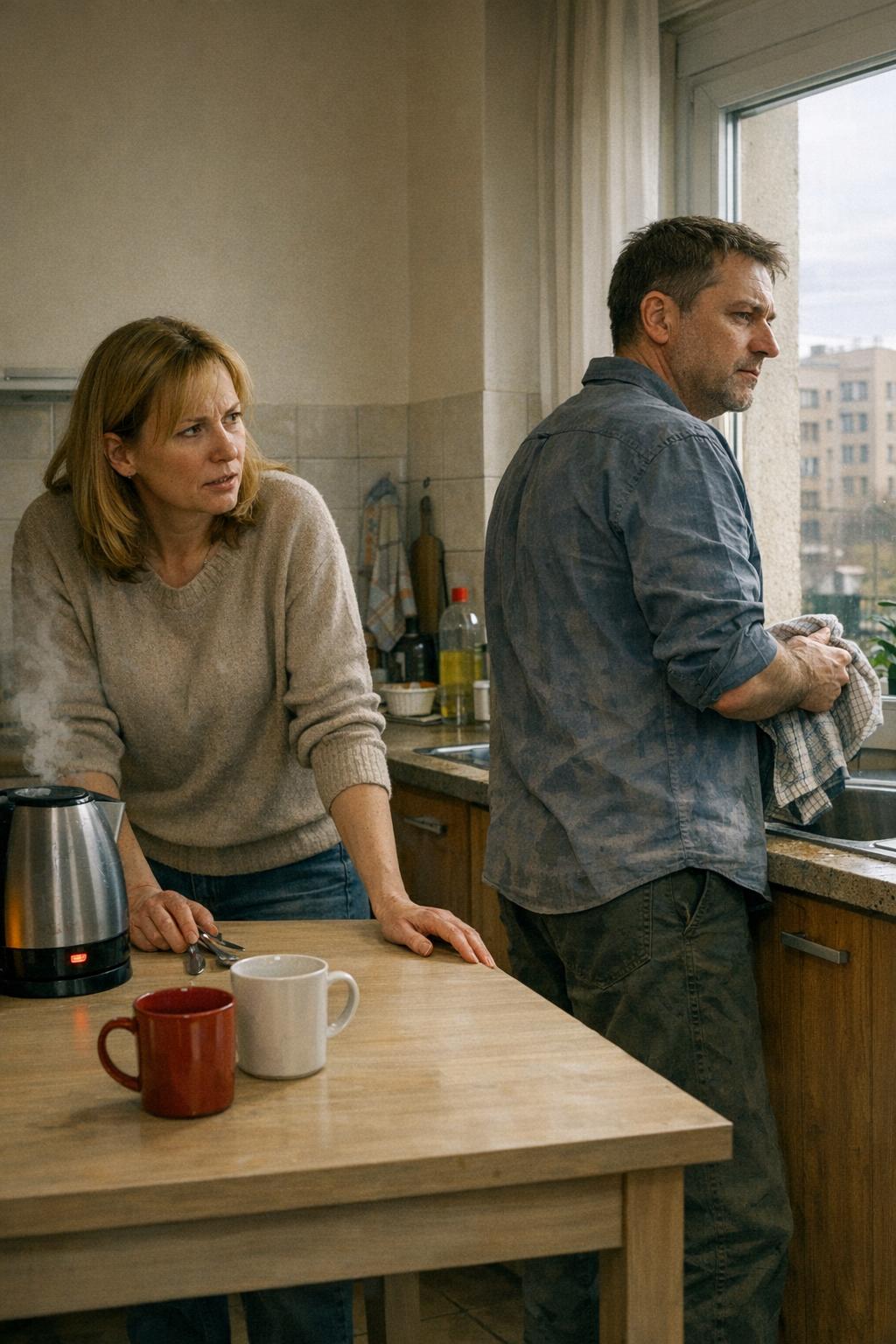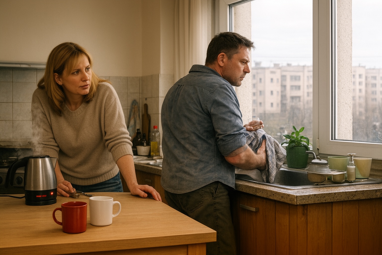 A konyhát frissen őrölt kávé illata töltötte be. Réka két bögrét tett az asztalra, bekapcsolta a vízforralót, majd a fiókból elővette a kanalakat. Gergő a mosogatónál állt, kezet mosott, és közben feszült arccal bámult kifelé az ablakon.